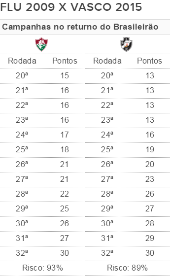 A campanha do Fluminense no Brasileirão de 2009, quando tinha só 1% de chances matemáticas de escapar do rebaixamento e conseguiu o milagre no jogo final do campeonato, vem servindo como um norte para o Vasco. O clube, que na atual temporada também chegou a ser dado como virtual rebaixado com 99% de risco de cair, vinha desde a 27ª rodada com retrospecto melhor no comparativo com o Tricolor há seis anos. Mas após o empate sem gols com o Grêmio no Maracanã, no último domingo, o Cruz-Maltino terminou pela primeira vez durante o returno com desempenho idêntico ao do rival: 30 pontos e ocupando a lanterna da competição.