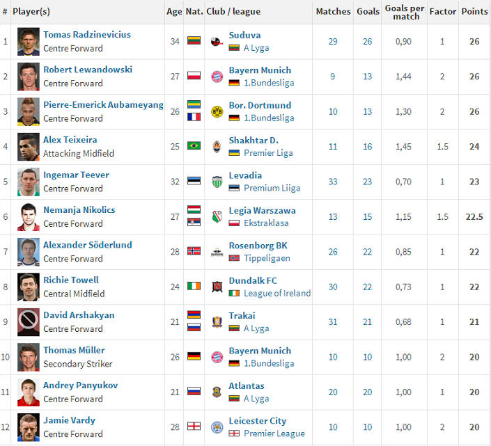 Não houve rodada do Campeonato Ucraniano no último fim de semana. Assim, Alex Teixeira, do Shakhtar Donetsk, que liderava a Chuteira de Ouro, caiu para 4º lugar na briga pelo prêmio de maior artilheiro da Europa. Porém, é do ex-vascaíno a melhor média de gols entre os 12 primeiros colocados: 1,45 (16 gols em 11 jogos).