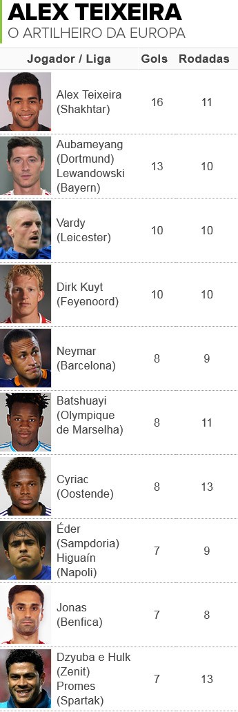 Na Polônia, apenas a 18ª liga mais bem ranqueada para a Uefa, o húngaro Nemanja Nikolic chega perto: tem 15 gols em 13 jogos. Conta a favor de Alex Teixeira o fato de ele não ser um camisa nove clássico, nem mesmo foi improvisado após a saída de Luiz Adriano para o Milan.