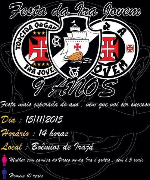 A Diretoria da Torcida Organizada Ira Jovem Vasco vem através desta anunciar a seus associados, líderes de província, componentes e simpatizantes a realização de nossa festa em comemoração aos 9 anos da Torcida.