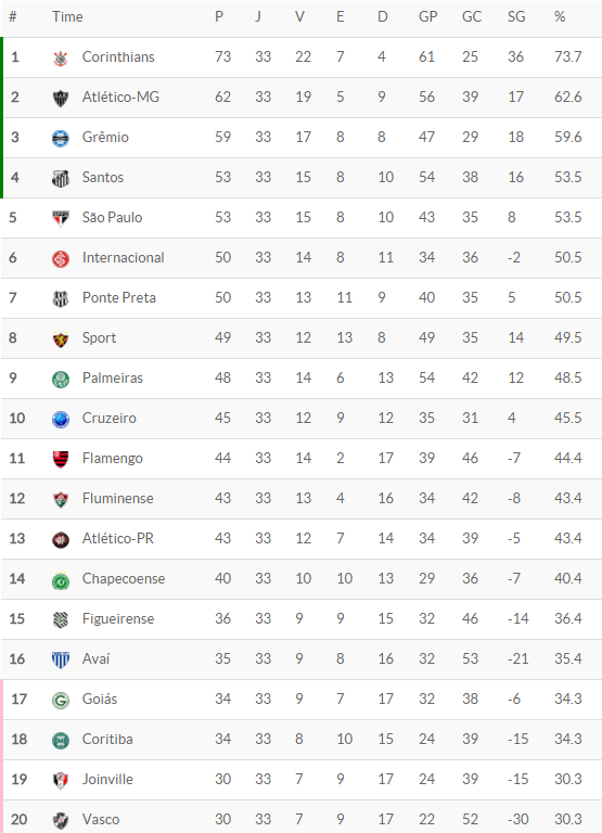 Terminada a 33ª rodada do Campeonato Brasileiro (faltam 5 para o fim), o Vasco, que foi derrotado pelo Fluminense por 1 a 0, segue na 20ª e última colocação na classificação e viu sua diferença para o 1º time fora do Z4 (Avaí, 16º colocado) subir de 4 para 5 pontos.