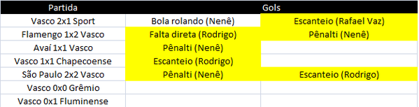 Último gol do Vasco que não nasceu de bola parada (escanteio, pênalti, falta): abertura de placar vs Sport, 2' de jogo, Nenê, 27ª