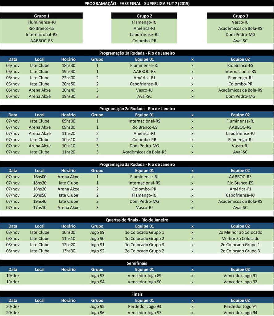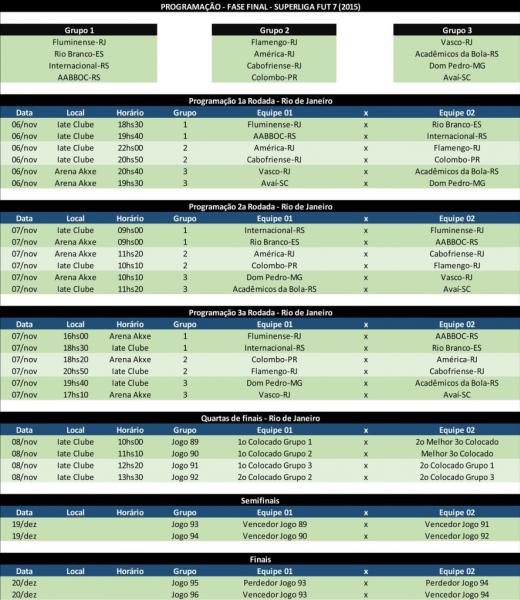 Cinco times do Rio de Janeiro vão disputar a classificação para as semifinais da Superliga, o Brasileirão-2015, a partir desta sexta-feira (06) até domingo (08). As equipes filiadas à Federação de Futebol 7 do Estado do Rio de Janeiro representam quase 50% dos clubes que vão entrar em campo por esta fase do Campeonato Brasileiro: America, Cabofriense, Flamengo, Fluminense e Vasco.