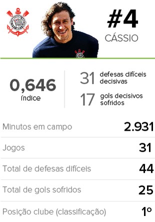 Líder do Campeonato Brasileiro, provável campeão e atuando na defesa menos vazada da competição, o goleiro do Corinthians foi convocado por Dunga para defender a Seleção. Com a alteração na 35ª rodada, feita pela CBF, o goleiro deve atuar pelo Timão em todos os jogos até o fim do Campeonato. Titular indiscutível do clube alvinegro, Cássio seria o líder do ranking se tivesse feito mais sete defesas difíceis decisivas. A questão é saber se uma vez garantido o título, o time vai manter a solidez defensiva. Se isso ocorrer, Cássio está no páreo para confirmar o que ele mesmo disse, que é atualmente o melhor goleiro do Brasil.