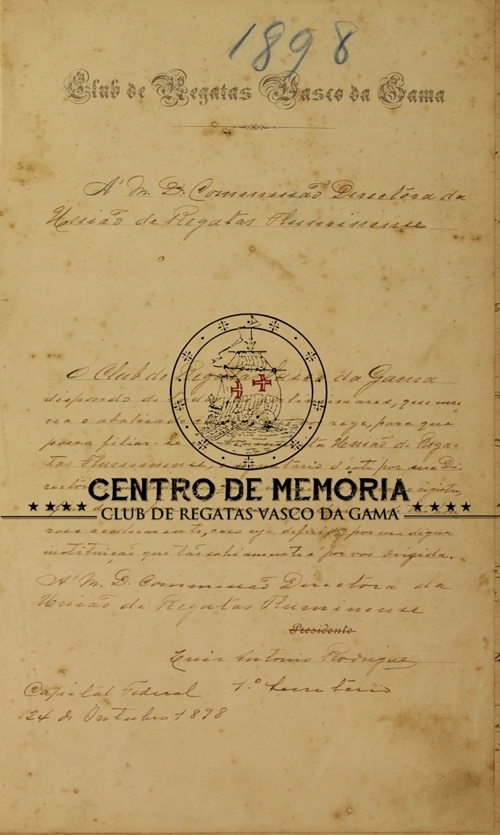 ![]() Pedido de filiação do Vasco à União de Regatas Fluminense, 24 de outubro de 1898. |