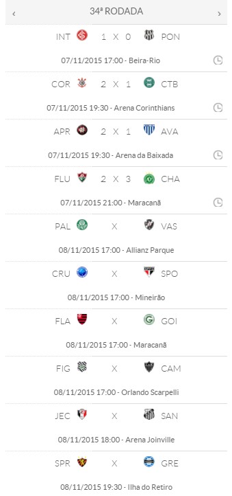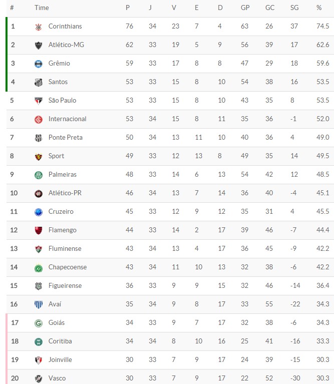 Quatro jogos abriram a 34ª rodada do Campeonato Brasileiro neste sábado (07/11). O Inter venceu a Ponte Preta por 1 a 0. O Corinthians derrotou o Coritiba, rival direto do Vasco na luta para sair do Z4, por 2 a 1, e pode se sagrar campeão já neste domingo (08/11), teoricamente enfrentando o Gigante da Colina mais relaxado no dia 19/11. Outro adversário direto, o Avaí, perdeu para o Atlético-PR por 2 a 1. E o Fluminense, em pleno Maracanã, foi derrotado pela Chapecoense - que também luta para fugir do Z4 - por 3 a 2.