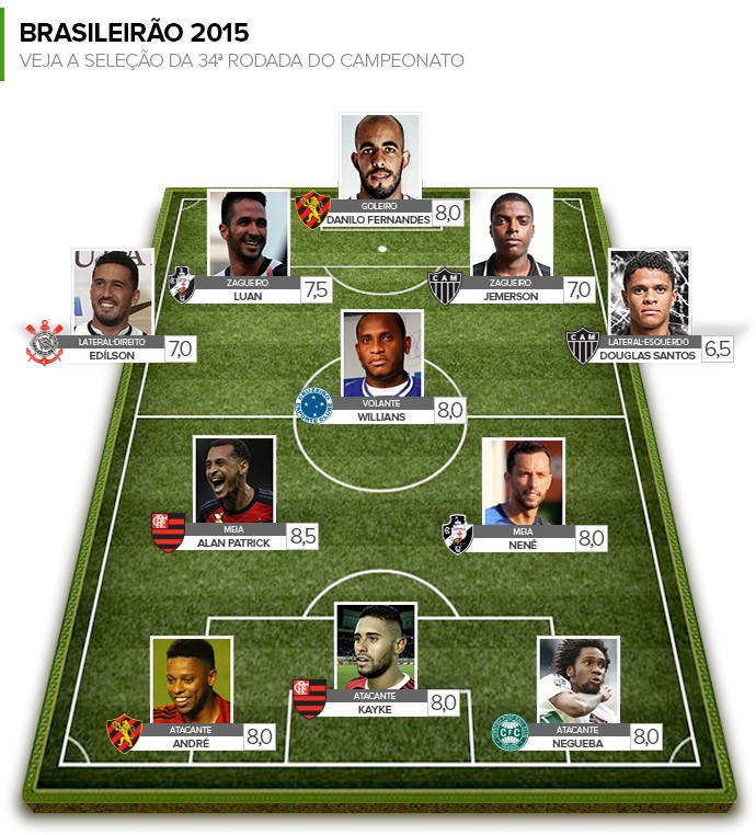 Kayke, que fez os outros dois do Rubro-Negro, também garantiu seu lugar na seleção. O Vasco é outro que emplacou dois jogadores: o zagueiro Luan e o meia Nenê, fundamentais no triunfo sobre o Palmeiras. Já o Atlético-MG pôs o zagueiro Jemerson e o lateral-esquerdo Douglas Santos. E o Sport tem o atacante André e o goleiro Danilo Fernandes, destaques contra o Grêmio. Completam o time ideal do fim de semana o lateral-direito Edílson (Corinthians), o volante Willians (Cruzeiro) e Negueba (Coritiba).