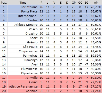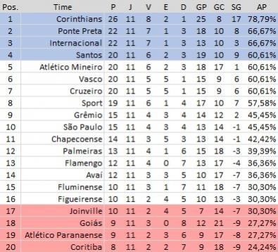 A campanha do Vasco nos últimos 11 jogos do Campeonato Brasileiro, ou seja, desde que derrotou a Ponte Preta fora de casa por 1 a 0, é a 6ª melhor do período: 20 pontos ganhos e aproveitamento de 60,6%. O desempenho é digno de G4, pois o número de pontos do Vasco é o mesmo do 4º e do 5º colocados (e é sempre bom lembrar que o Gigante da Colina foi prejudicado pela arbitragem em algumas dessas 11 partidas). Confira abaixo: