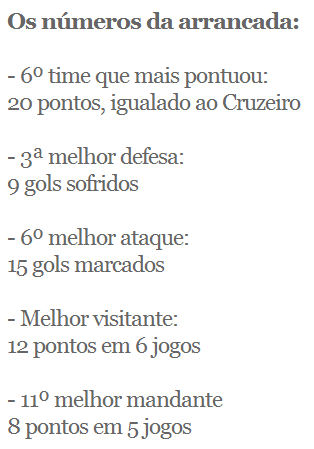 Análise dos números do time vascaíno, com base em levantamento do site Futdados, permite ver avanços notáveis, mas também percalços que podem ser decisivos nos próximos jogos – principalmente pelo desafio da próxima rodada. O time de São Januário volta para casa no dia 19 para receber o Corinthians. Como mandante, o Vasco até melhorou um pouco nesta arrancada, mas ainda soma poucos pontos. Foram só oito em cinco jogos, ficando apenas com o 11º melhor aproveitamento, de 53% - de toda forma um avanço para quem tinha o pior aproveitamento como mandante, com 25% dos 13 pontos conquistados nas 23 primeiras rodadas do Brasileiro.