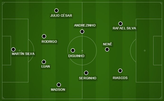 Se o treinador escolher manter a formação que venceu o Palmeiras, Andrezinho seguiria do lado esquerdo do campo, e Serginho auxiliaria Diguinho na marcação pela direita (veja na imagem abaixo). Nesse esquema, a marcação funcionou bem e levou poucos sustos na Arena Palmeiras.