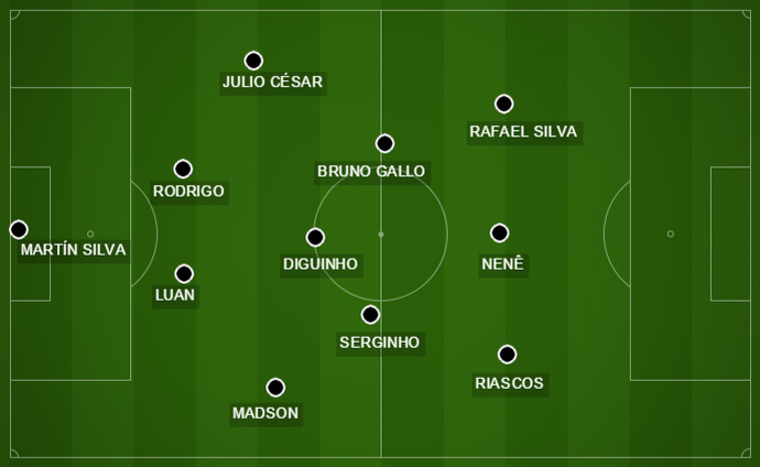 Mas há a possibilidade também de Jorginho escalar os três volantes ao mesmo tempo para reforçar a marcação no meio de campo e explorar contra-ataques contra o líder do campeonato, dono do melhor ataque e da defesa menos vazada. Com isso, Diguinho seria o primeiro volante, tendo o auxílio de Bruno Gallo e Serginho pelos lados do campo (veja na imagem abaixo). Assim, Nenê seria mais adiantado para jogar mais perto de Rafael Silva e Riascos.