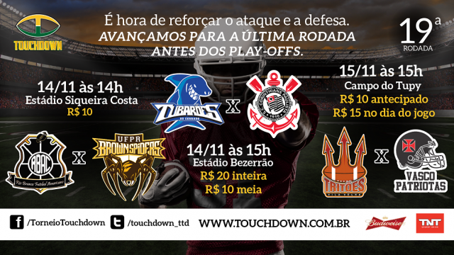 Restando apenas mais três partidas para encerramento de mais uma temporada regular, o Torneio Touchdown apresenta no próximo sábado (14/11) o confronto entre o Rio Branco FA (1-5) jogando contra a equipe paranaense do Brown Spiders (2-4) no Estádio Siqueira Costa na grande Vitória-ES. Na Capital Federal, será a vez do Tubarões do Cerrado (2-4) receber o Corinthians Steamrollers (1-5) no Estádio Bezerrão. Já no domingo (15/11) e fechando a mais uma semana, teremos o clássico entre o Vila Velha Tritões (6-0) diante do Vasco da Gama Patriotas (5-1) no Campo do Tupy em Vila Velha-ES.