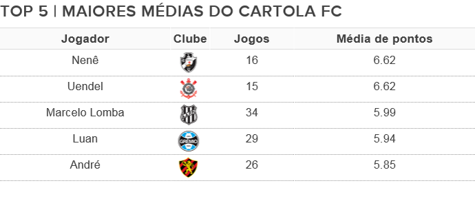 Em grande fase, o atacante Nenê tem sido a principal arma do Vasco na briga contra o rebaixamento no Brasileirão. Mas não é somente a torcida cruz-maltina que tem vibrado com as atuações do camisa 10. Com sete gols e três assistências em 16 jogos, ele se tornou o jogador com a maior média de pontos do Cartola FC, ao lado do lateral-esquerdo Uendel, do Corinthians - levando em consideração apenas os que atuaram em pelo menos 40% das partidas no campeonato. Ambos somam 6.62 pontos no fantasy game.
