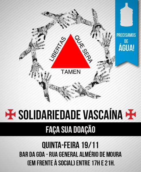 Nossa história é de nobreza e superação! Superamos a opressão, preconceito e tantas outras dificuldades. Que tal mostrarmos a força e grandeza da torcida vascaína mais uma vez e levarmos doações de água para as vítimas de Minas Gerais no jogo contra o Corinthians?