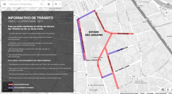 Um esquema especial de trânsito e segurança foi montado pelas autoridades responsáveis por eventos esportivos para a partida da próxima quinta-feira (19/11), às 22 horas, entre Vasco e Corinthians. O GEPE terá um efetivo de 210 homens no estádio de São Januário, palco do jogo, contando ainda com o auxílio externo de 150 policiais do 4º Batalhão de São Cristóvão, da Cavalaria e do Batalhão de Choque.