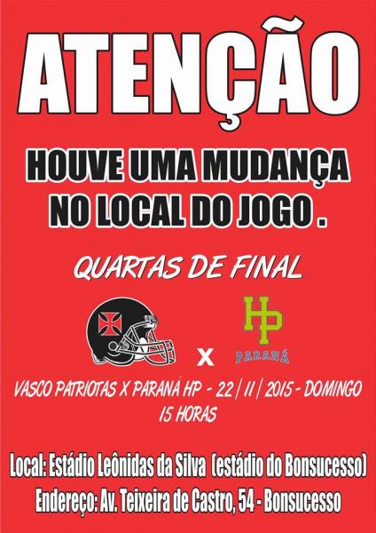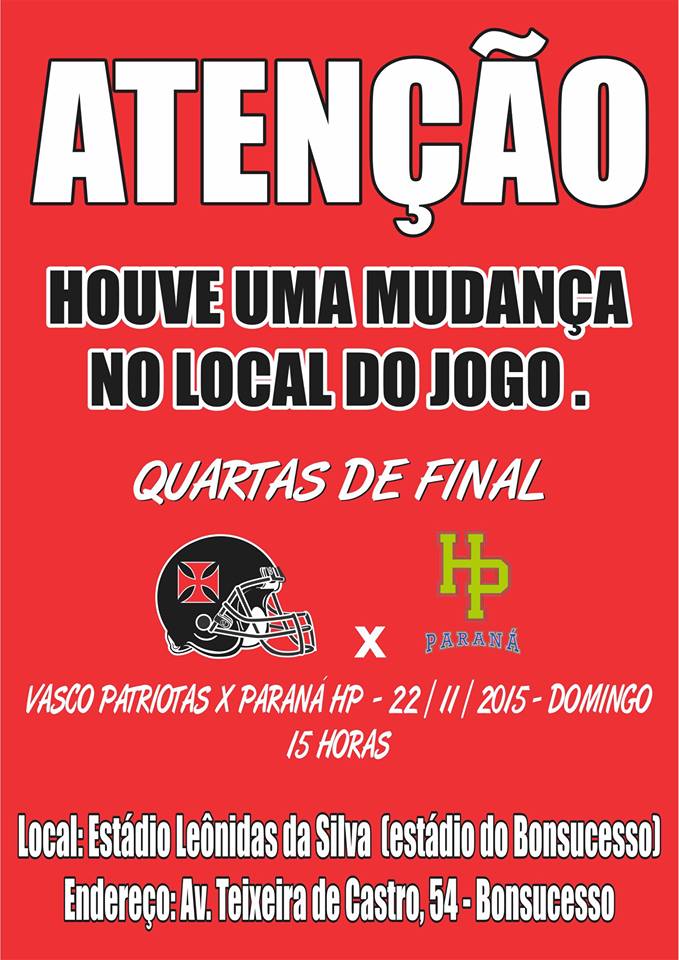 Ocorreu um imprevisto e o Vasco da Gama Patriotas NÃO poderá jogar no campo da portuguesa . O novo local do jogo é no campo do Bonsucesso.