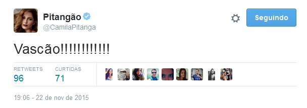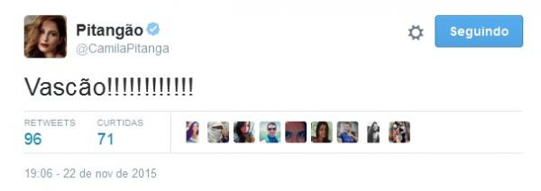 Atriz Camila Pitanga comemora vitória do Vasco em rede social