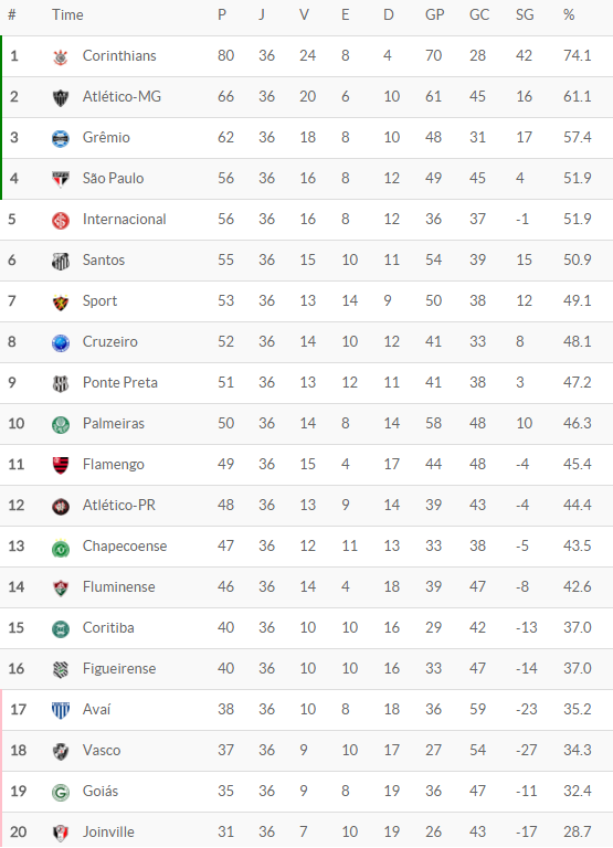 Terminada a 36ª rodada do Campeonato Brasileiro (faltam 2 para o fim), o Vasco, que derrotou o Joinville por 2 a 1, subiu da 19ª para a 18ª colocação na classificação e viu sua diferença para o 1º time fora do Z4 (Figueirense, 16º colocado) cair de 4 para 3 pontos. O resultado rebaixou o Joinville.