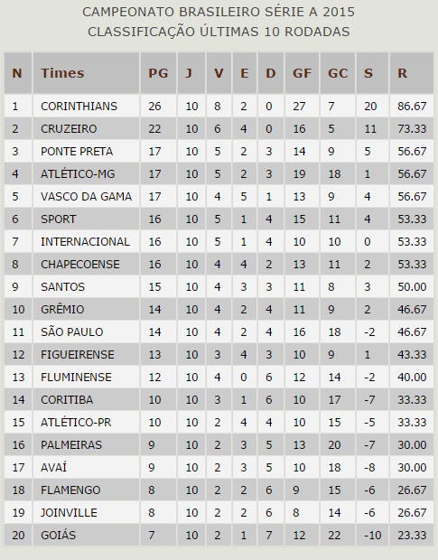 O Vasco é dono da 5ª melhor campanha das últimas 10 rodadas do Campeonato Brasileiro, sendo que seu número de pontos ganhos, 17, é igual ao da 3ª colocada, a Ponte Preta.