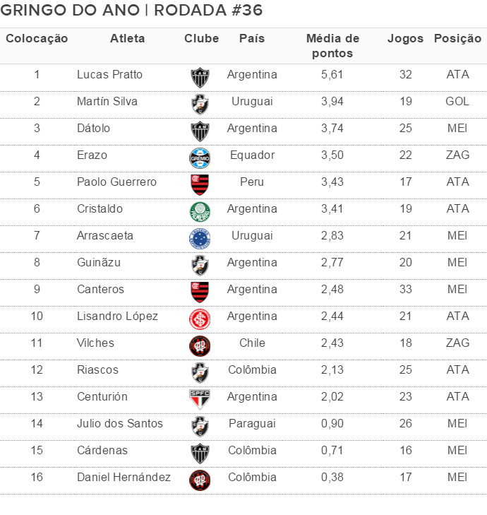 Se a liderança está consolidada, a alternância na segunda colocação é intensa, o que na verdade reforça a superioridade apresentada por Pratto ao longo de toda a temporada. Na rodada passada, Pratto marcou 6,90 no empate do Atlético-MG com o Goiás, em Belo Horizonte. Apesar de ter levado um gol na vitória do Vasco fora de casa por 2 a 1 sobre o Joinville, o goleiro uruguaio Martín Silva, do Vasco, retomou a segunda colocação, que na rodada passada havia passado para o meia argentino Jesús Dátolo.