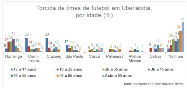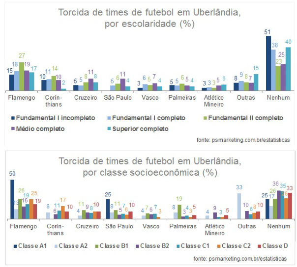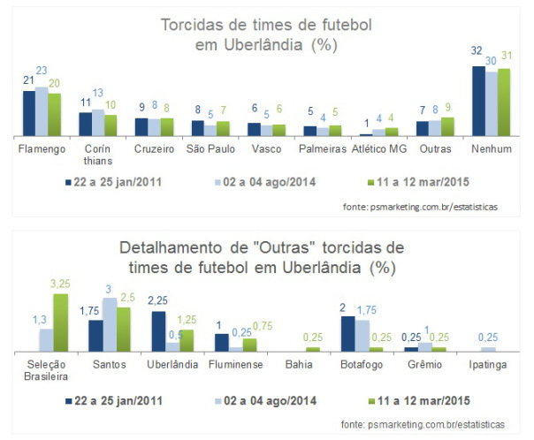 O Flamengo nada de braçadas na cidade, apresentando percentual (20%) que representa o dobro da segunda maior torcida, a do Corinthians (10%). Dentro das flutuações de margem de erro descritas, curioso notar que as duas maiores torcidas verificaram quedas idênticas – na casa de três pontos percentuais – desde o ano anterior. O Cruzeiro segue como terceiro maior (8%) e o São Paulo é quarto (7%). Em seguida temos Vasco (6%), Palmeiras (5%), Atlético-MG (4%), Santos (2,5%) e Uberlândia (1,25%). Todas as demais agremiações não ultrapassam a marca unitária. Indivíduos sem time somam importantes 31%.