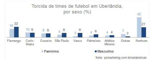 Entre os principais consumidores de futebol (indivíduos do sexo masculino) o Flamengo é ainda maior em Uberlândia, monopolizando 22% das preferências. Ainda entre eles, São Paulo e Vasco saltam a 9%, ultrapassando o Cruzeiro (8%) e se equiparando ao próprio Corinthians. O time paulista, aliás, é o único com maioria feminina (10%), algo há muito verificado em nossas análises. Em meio a elas, vascaínas são apenas 2%, um impressionante desequilíbrio de gênero da torcida cruzmaltina. Outro dado importante é a rejeição do futebol entre mulheres em escala duplicada: 42% das uberlandenses do sexo feminino não possuem time, contra 21% dos homens.