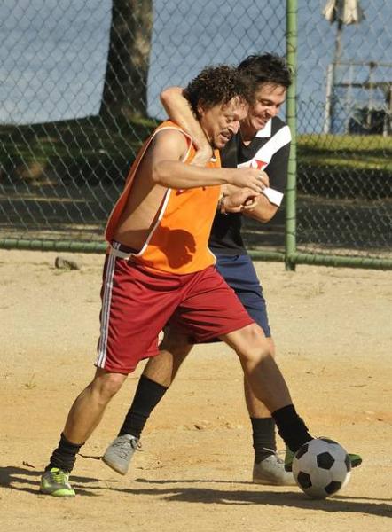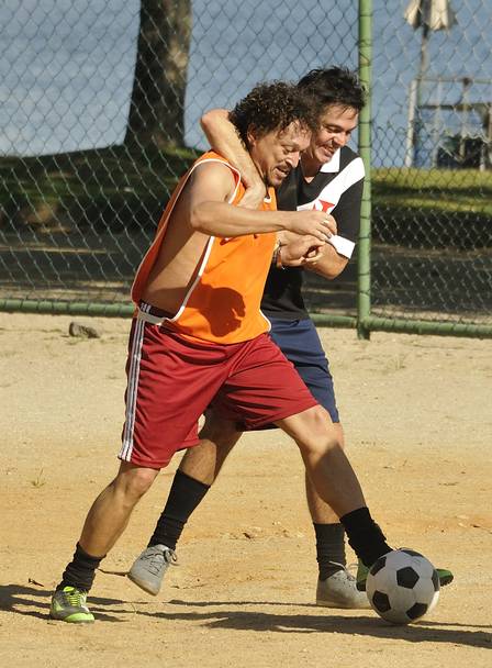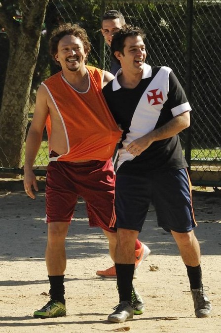 Fábio Lago e Bruno Mazzeo começaram a gravar suas primeiras cenas de “A regra do jogo” numa pelada no Aterro. Na próxima novela das nove — que estreia dia 31 de agosto — eles serão Oziel e Rui, amigos que são vizinhos no fictício Morro da Macaca. Casado com Indira (Cris Vianna), Oziel vai acabar tendo um caso com Tina (Monique Alfradique), mulher do amigo. Ao saber do romance do marido com a vizinha, Indira vai esquecer até a sua religião para dar o troco: a evangélica seduz Rui e inicia um caso com o melhor amigo do marido.O quarteto será o núcleo de humor da história e, pelo clima nas gravações, a dupla parece que vai fazer sucesso.
