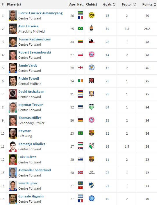 Mesmo sem ter marcado na rodada do Campeonato Ucraniano, o ex-vascaíno Alex Teixeira, do Shakhtar Donetsk, segue brigando pela Chuteira de Ouro, prêmio concedido anualmente ao maior artilheiro das Ligas Europeias. Alex Teixeira, que é pretendido pelo Chelsea, ocupa atualmente a 2ª colocação no ranking.