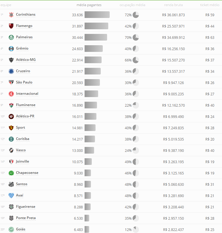 Com apenas duas rodadas para o fim do campeonato, muitos clubes já têm situação definida, e, por isso, não atraem mais tanto público aos estádios. Atlético-MG, Grêmio e Palmeiras apresentaram quedas em suas médias, mas mantêm-se no topo do ranking. Lanterninha no quesito público, o Goiás melhorou sua média, mas não o suficiente para deixar a Ponte Preta para trás.