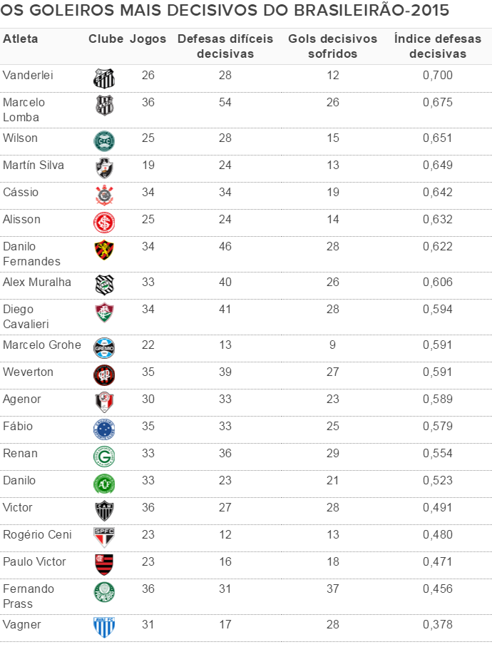 O Vasco, por sua vez, também está muito bem representado na lista de goleiros mais decisivos do Campeonato Brasileiro. O uruguaio Martín Silva é o quarto colocado no ranking. O time carioca está a três pontos do primeiro clube fora da zona de rebaixamento e precisa vencer. O Santos está a um ponto do G-4, mas um empate na próxima quarta-feira, contra o Palmeiras, lhe garante o título e a vaga na Libertadores-2016 via Copa do Brasil.