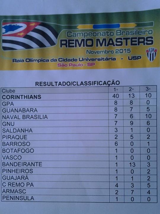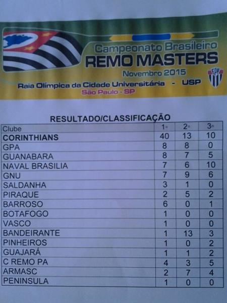 Parecia futebol. O Corinthians dominou amplamente os adversários e conquistou o Campeonato Brasileiro Máster de Remo, com 40 vitórias em 93 provas (quatro além do previsto) disputadas no fim de semana passado, na raia da USP, em São Paulo. O alvinegro paulista ganhou 32 ouros a mais que GPA (RS) e Guanabara (RJ), além de 13 pratas e 10 bronzes, num total de 63 medalhas.