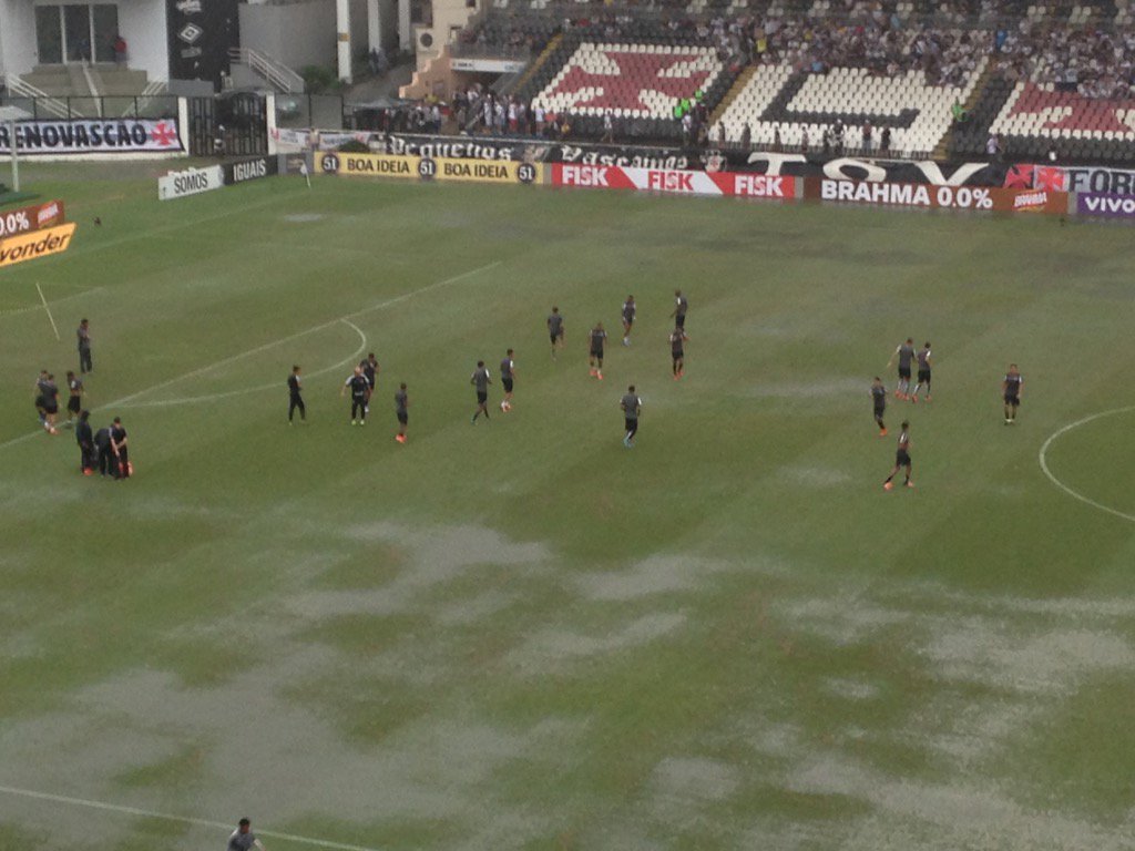 AlvaroOliveiraFilho @alvaroofilho Jogadores do Santos começam o trabalho de aquecimento, ainda com muita água no gramado.