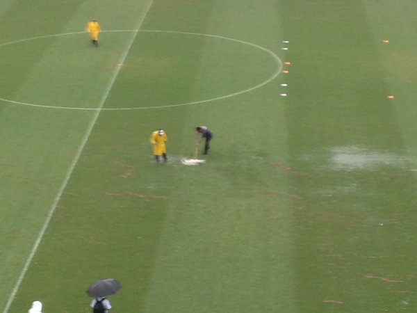 Dois funcionários do Vasco tentam desfazer as poças no gramado. Já há condições de começar o jogo.