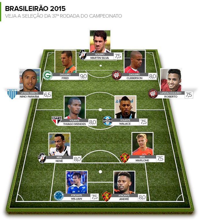 Outro zagueiro também provou que é capaz de desequilibrar no ataque. Trata-se de Cleberson, do Atlético-PR, autor de dois gols no 3 a 0 sobre o Flamengo. O Furacão emplacou o defensor e também o lateral-esquerdo Roberto, que fez um dos gols mais bonitos da rodada. Apenas o Vasco conseguiu colocar outros dois jogadores: o meia Nenê e o goleiro Martín Silva. A seleção da vez tem ainda o lateral-direito Nino Paraíba (Avaí), os volantes Thiago Mendes (São Paulo) e Walace (Grêmio), o meia Marlone (Sport) e os atacantes André (Sport) e Willian (Cruzeiro).
