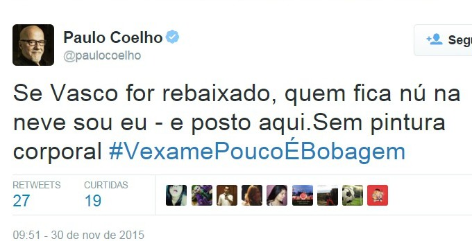Agora foi a vez do escritor Paulo Coelho fazer uma promessa caso o time Cruz-Maltino seja rebaixado. Ele escreveu em sua conta no Twitter, que confirmada a ida para a Série B, aparecerá nu. Na neve. E sem pintura.