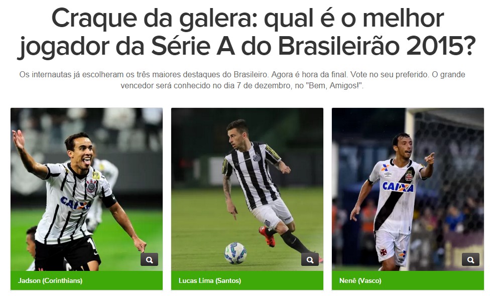 Os internautas já escolheram os três maiores destaques do Brasileiro. Agora é hora da final. Vote no seu preferido. O grande vencedor será conhecido no dia 7 de dezembro, no "Bem, Amigos!".