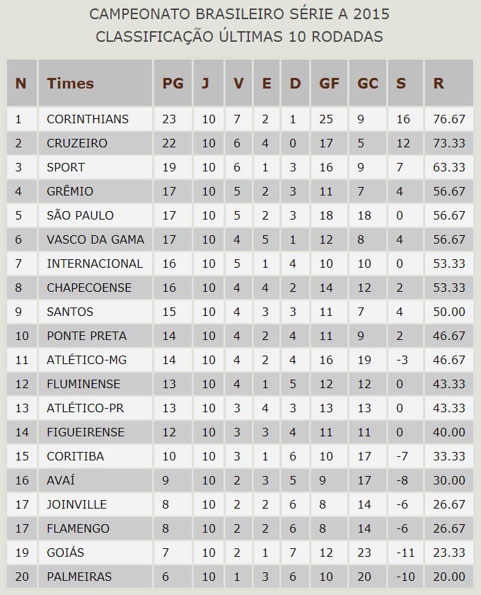 O Vasco tem a 6ª melhor campanha das últimas 10 rodadas do Campeonato Brasileiro, sendo que seu número de pontos, 17, é igual ao do 4º e do 5º colocados.