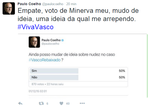 Escritor Paulo Coelho volta atrás em promessa de ficar nu em caso de rebaixamento do Vasco