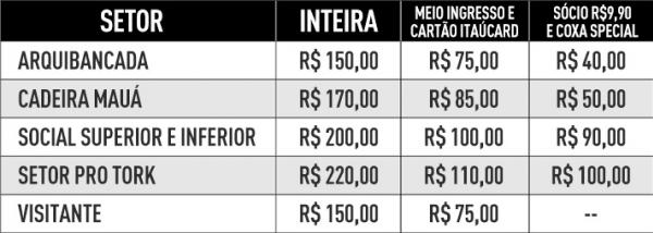 Sócios dos planos Torcedor Coritiba (R$150) e Coxa Special têm descontos diferenciados para esta partida, pagando menos da metade do valor inteiro. Confira no quadro abaixo.