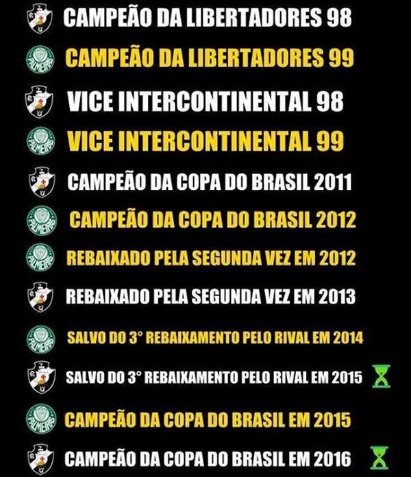 Meme relaciona coincidências entre Vasco e Palmeiras e 'prevê' permanência na Série A e título da Copa do Brasil