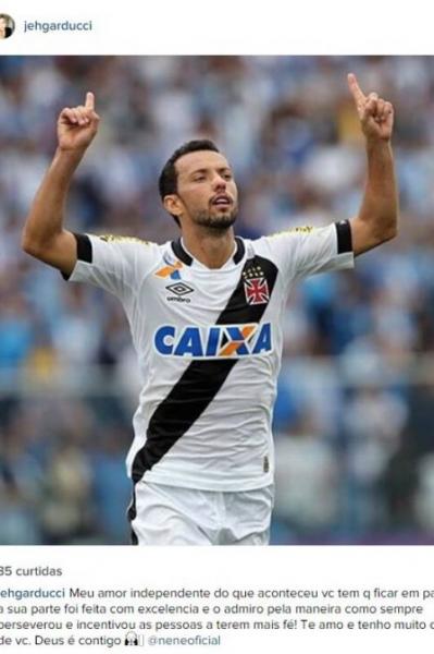 A esposa do atacante Nenê, do Vasco, Jéssica Garducci, consolou o jogador pelas redes sociais após o rebaixamento do Cruz-Maltino neste domingo. O Vasco caiu para a Série B do Brasileiro pela terceira vez em sua história após empatar em 0 a 0 com o Coritiba, no Couto Pereira.