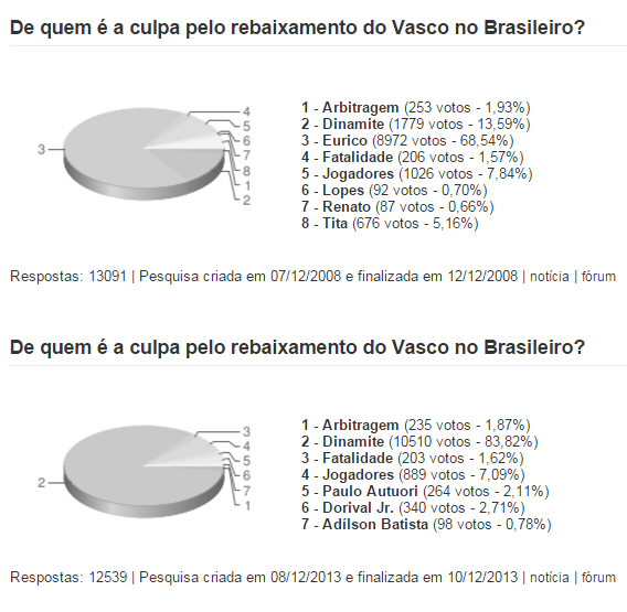 Nota: A pesquisa atual segue o mesmo padrão das realizadas nos outros rebaixamentos do Vasco, em 2008 e 2013: Arbitragem, Fatalidade, Jogadores, Presidentes (todos os do período da competição) e Técnicos (todos os do período da competição), todos eles em ordem alfabética. Veja, abaixo, os resultados das pesquisas anteriores.