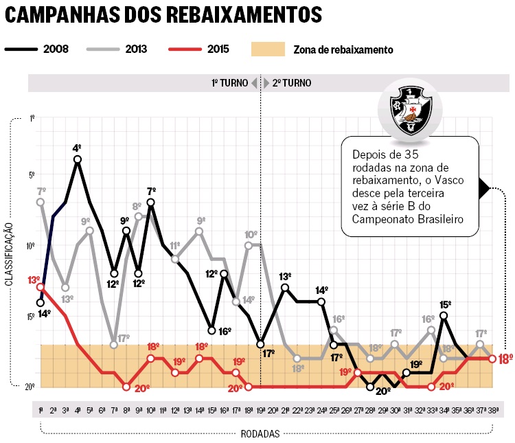 Um levantamento do jornal O Globo mostra que o Vasco passou um maior número de rodadas na zona do rebaixamento (Z4) no Brasileiro 2015 do que em 2008 e 2013, os outros anos em que acabou caindo para a Série B. Confira: