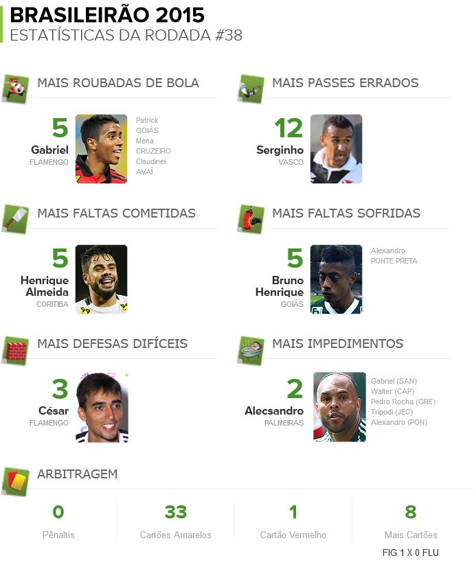 A 38ª e última rodada do Campeonato Brasileiro 2015 foi marcado pelas quedas de Vasco, Avaí e Goiás para a Série B na próxima temporada. Nos números do fim de semana, um atleta cruz-maltino se destacou em uma estatística negativa. O volante Serginho errou 12 passes no empate sem gols diante do Coritiba e não conseguiu dar sequência aos lances no meio de campo.
