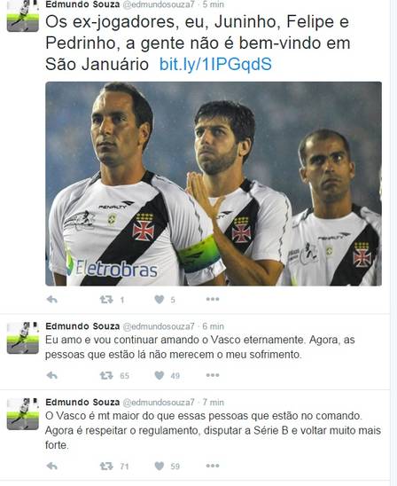 “Boa tarde! O Vasco é muito maior do que essas pessoas que estão no comando. Agora é respeitar o regulamento, disputar a Série B e voltar muito mais forte. Eu amo e vou continuar amando o Vasco eternamente. Agora, as pessoas que estão lá não merecem o meu sofrimento. Os ex-jogadores e ídolos como eu, Juninho, Felipe e Pedrinho não somos bem vindos em São Januário. Imagina como está o clube. Uma maravilha”, escreveu no Twitter.