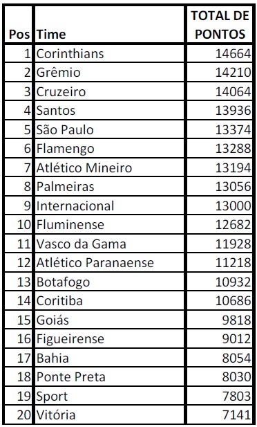 Pontuação do Ranking Nacional de Clubes 2016 (projeção):