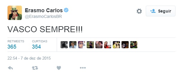 No Twitter, Erasmo Carlos exalta o Gigante da Colina: 'Vasco Sempre!'
