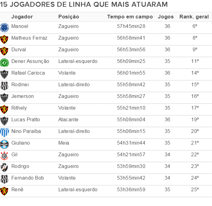 Numa relação só de jogadores de linha, o Top 5 teria, além do cruzeirense Manoel, a dupla de zaga do Sport, Matheus Ferraz e Durval; o lateral-esquerdo da Chapecoense Dener Assunção (11º no geral, com 35 jogos e 56h09min25); e o volante do Atlético-MG Rafael Carioca (14º no geral, com 36 jogos e 56h01min55). Sem os goleiros, prevalecem os zagueiros e laterais. Por isso, chamam a atenção as presenças de Lucas Pratto (Atlético-MG), único atacante da relação (9º de linha e 19º no geral) e de Giuliano (Grêmio), único meia (11º de linha e 21º no geral).