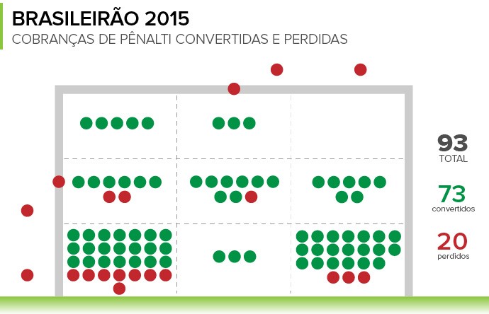 Do total de pênaltis, 73 foram convertidos pelos cobradores. Outros 20 foram desperdiçados, 14 cobranças defendidas pelos goleiros, 4 foram para fora, uma bateu na trave e outra no travessão. Veja no gráfico abaixo todos os detalhes das cobranças de pênalti: