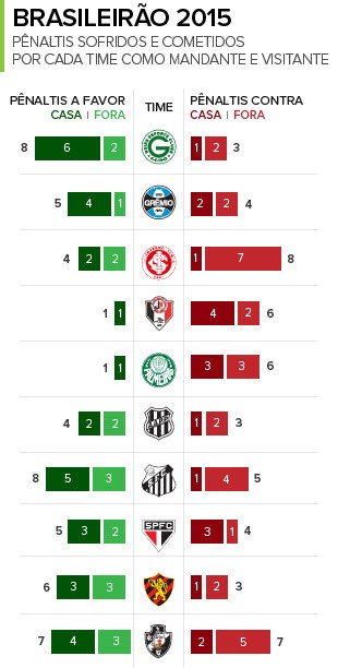 Ao longo do Brasileirão, os times que tiveram mais penalidades a favor foram Goiás e Santos, com oito cada. O Esmeraldino teve seis pênaltis assinalados no Serra Dourada e mais dois fora de casa. O Alvinegro Praiano obteve cinco cobranças na Vila Belmiro e outras três no território adversário. As equipes com menos pênaltis pró são Joinville e Palmeiras, ambos com apenas um.